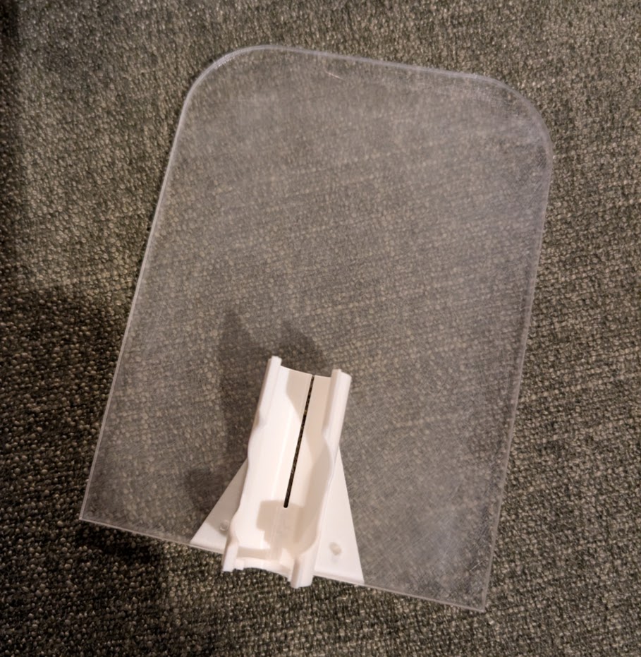 I was planning to laser cut a clear acrylic cover for the housing, and I happened to be heading out to the machine shop soon, so I quickly sketched up an acrylic shape with a slot and holes, and figured I’d come up with a mounting bracket for it later.