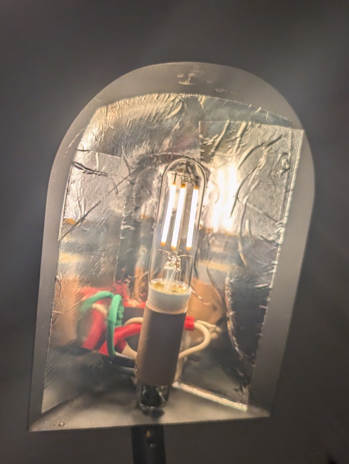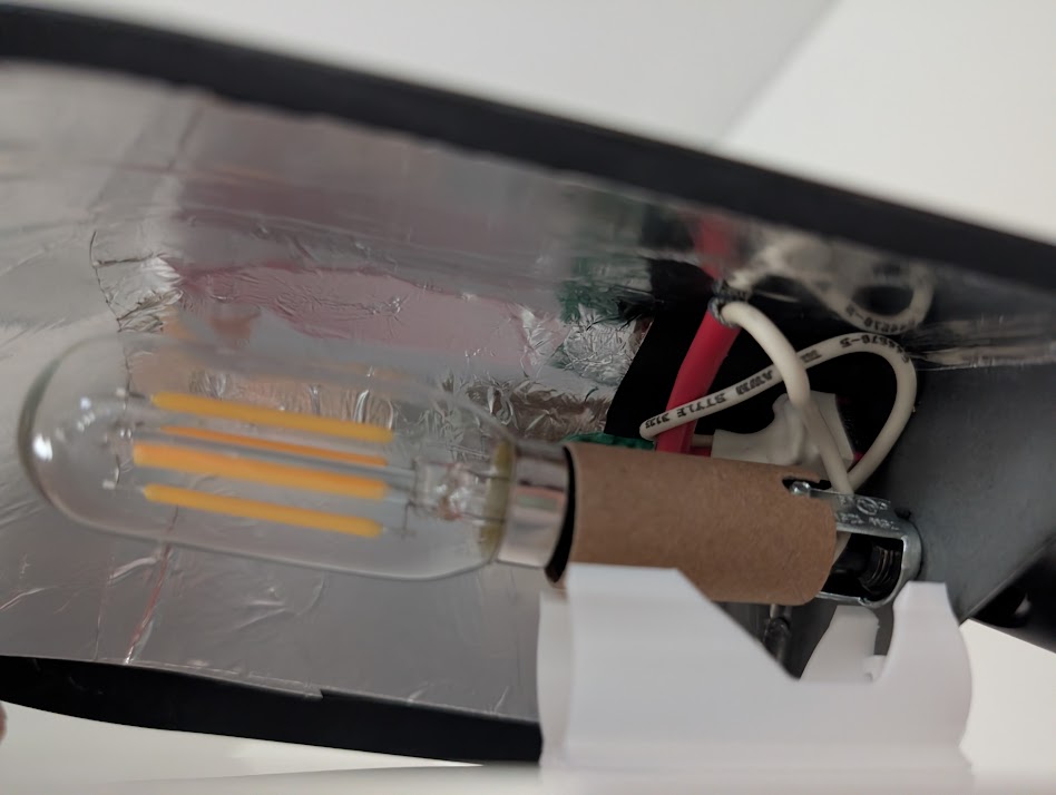 I re-soldered the wires, attached the socket, and lined the inside of the lamp with reflective tape.