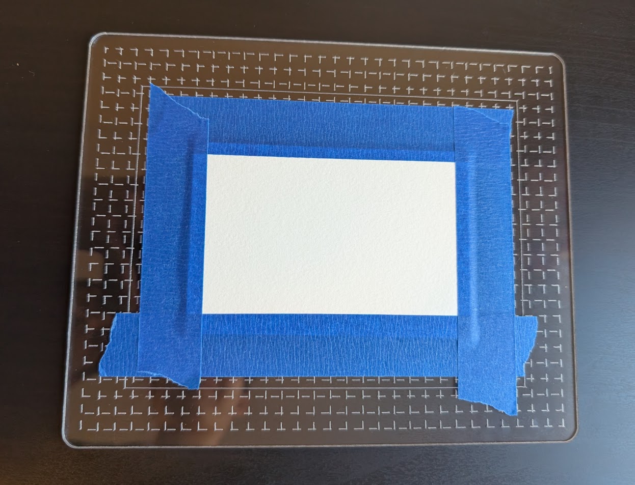 She uses a handful of different specific sizes of paper, and tapes them down to a flat surface with painter’s tape. The tape needs to be well levelled and centered, so that the paintings have a nice border afterwards.