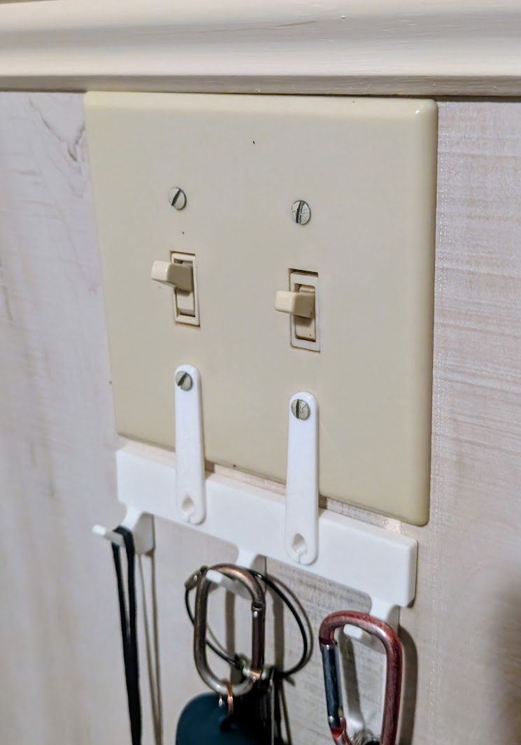 A first draft of a modular design for a wall-mounted key-hook that attaches to a light-switch plate.