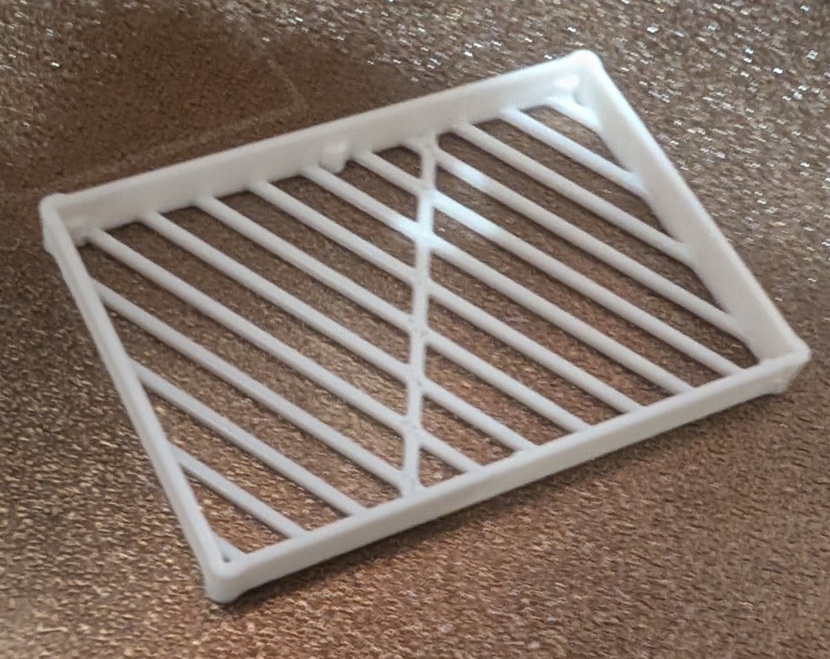 I made a really quick line drawing of a box with rounded corners, so it could press fit nicely on top of the fan. I used some minimal cross beams to protect it without impeding airflow too much, and some small bumps to act as standoffs.
